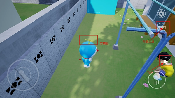 4、按照图示操作,点击哆啦A梦的万能口袋,我装备上竹蜻蜓后,右下角会出现一个“fly”按钮,点击该按钮就能实现起飞。