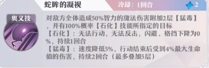 美杜莎的基础速度比晴明快20点,加上她能100%石化目标的奥义技,这让她在竞技场中占据了稳固的地位。战斗时,她可以先手石化对方的控制英雄,接着我方晴明再冻住其他敌人,最后由小丑根据敌方血量情况选择单点输出或AOE攻击。