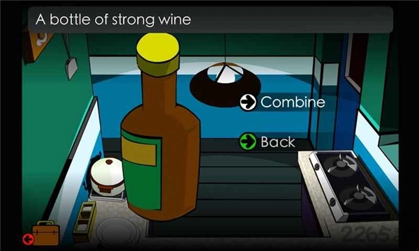 9、先点击取出一块肉,接着回到进入厨房的位置并往左侧移动,在左下角取一个酒瓶和一个盘子。点击盘子使其放大;然后点击肉,再点击放大的盘子,就能得到盛有肉的盘子;之后点击酒瓶,再点击这个肉盘子,即可获得“一盘子浸过烈酒的肉”。