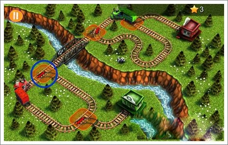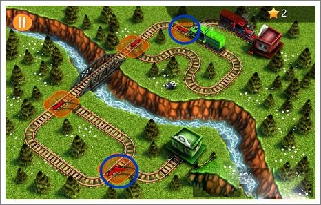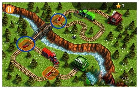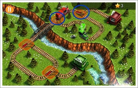 3、等右侧火车驶过转弯处后,迅速点击蓝圈位置,让左侧火车通过。要注意,这个操作的时间窗口比较短,得快速完成调整。