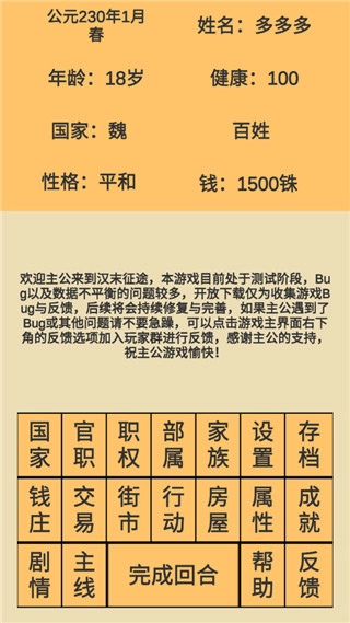 汉末征途是一款三国题材的角色扮演官场升官类游戏,玩家将以东汉末年的无名小卒身份,从零开始在三国世界开启自己的人生。在游戏中,玩家可以选择入朝为官,辅佐帝王;或征战沙场,建立功勋;亦可经营商业,富甲一方;或积蓄实力,图谋帝王之业。游戏的玩法初期较为复杂,但熟悉后会发现系统十分完备,能体验到非常真实的乱世成长历程。