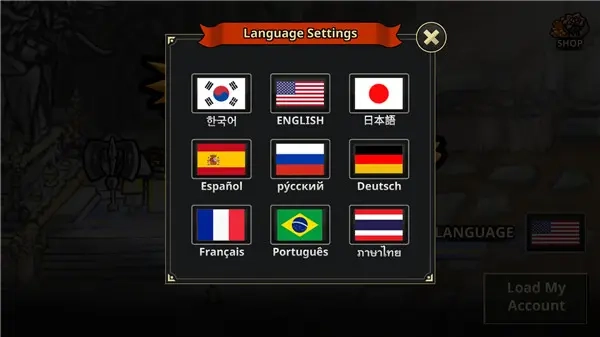 2、进入首页后,玩家可通过右侧的language选项调节系统语言。