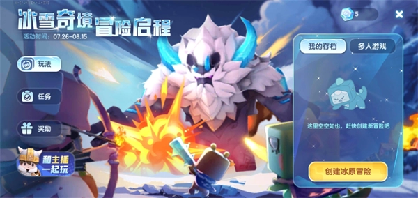 1、进入后首先会看到右上角有个“冰原冒险”入口,点击即可创建冰原冒险;要是不想独自游玩,点击左下角就能和主播一同体验。