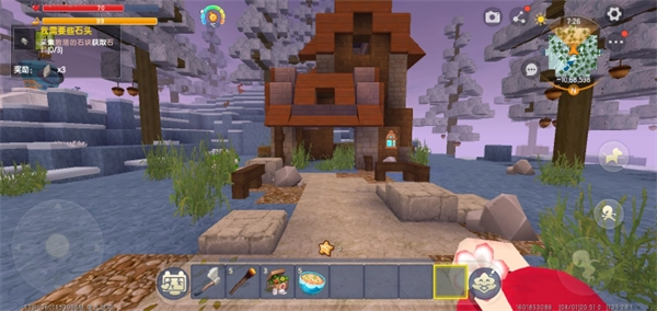 2、我们点击创建冰原冒险,进入后会有相关介绍,可看可不看,点击跳过,我们就会出现在冰原附近,这里也有一座小房子,屏幕左上角会显示一些目标,完成任务能获得相应奖励。