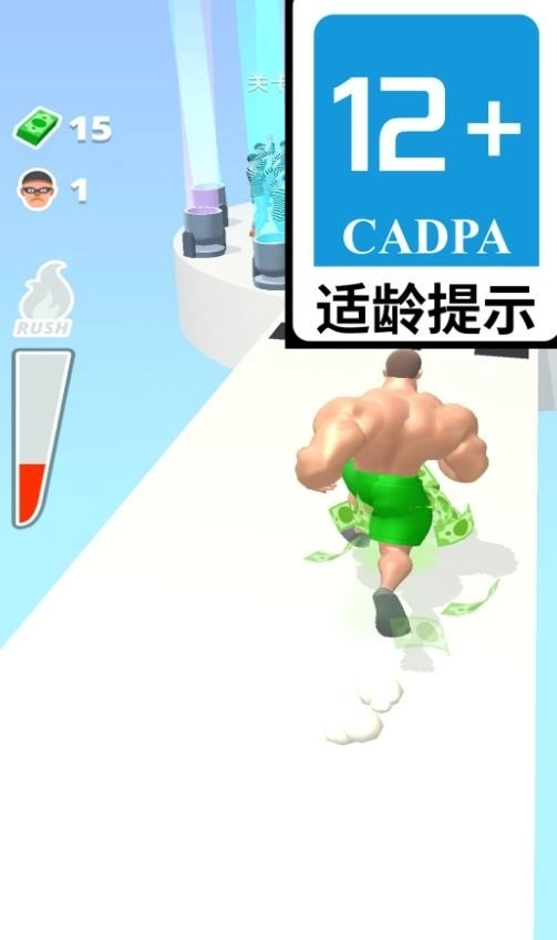 2、赛道上散落着各种健身相关道具,收集哑铃,能提升肌肉男的力量值,积累到一定程度,可触发强力技能。