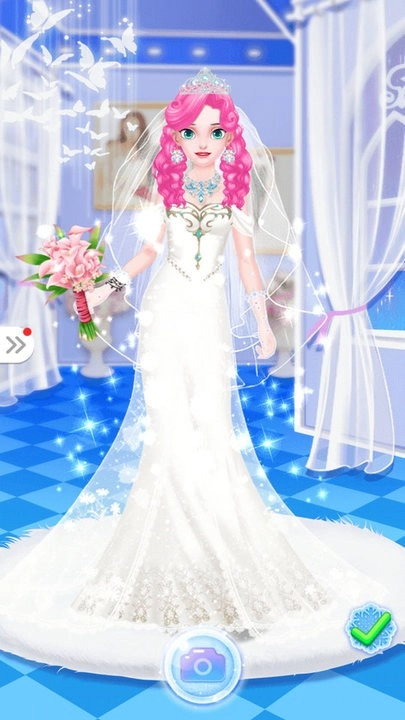 4、布置舞台背景选择公主姿势,添加闪光特效后点击拍照键,将完美造型存储至相册分享展示。