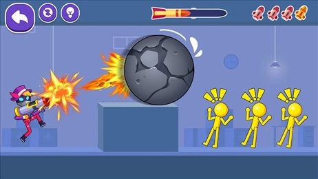 1.控制火柴人灵活移动,通过跳跃躲避敌人的攻击,再进行精准射击,以此完成清关任务。