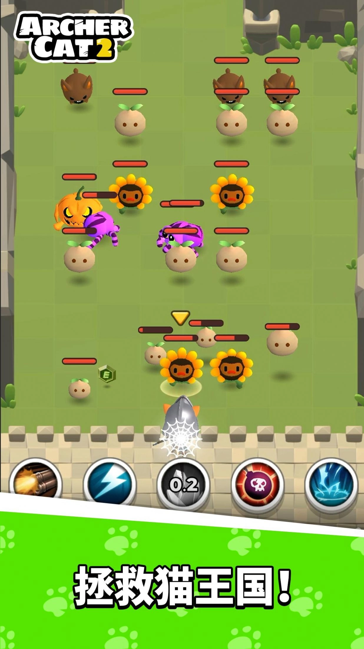 1、核心玩法为玩家操控萌趣的猫咪角色,借助弓箭射击各类目标。