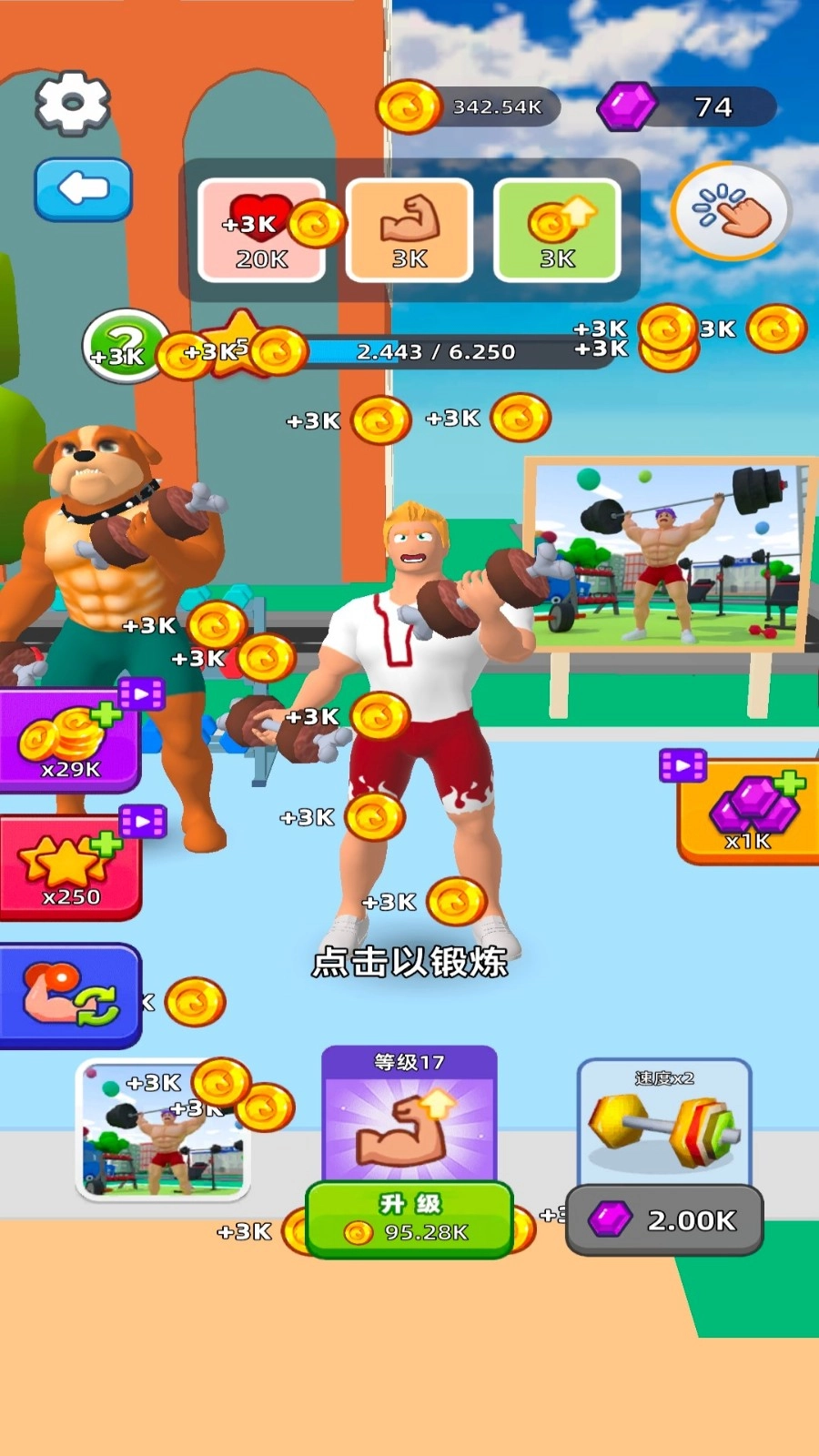1、通过快速点击屏幕来完成俯卧撑训练,每次点击屏幕都能获得10到50枚随机数量的金币奖励。