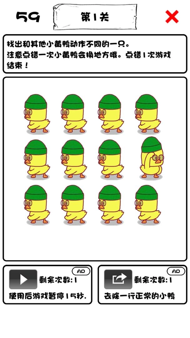 一起来找小黄鸭是一款全新的休闲益智类,在一起来找小黄鸭中,玩家需要在众多小鸭中找到与众不同的那一只方才能通关,可爱的画风,丰富的关卡,富有难度的关卡设计,定能给你带来前所未有的益智游戏体验,快一起来找小黄鸭来试试吧。