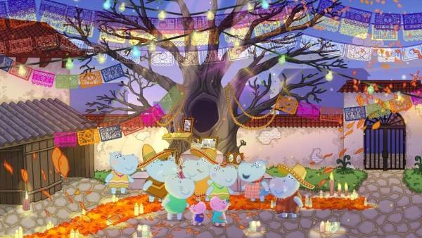 1.小河马的亲友们将胆子搁在院子里一根粗大的枯枝上。然而这一回,亡灵节的祭祀仪式被打断了;