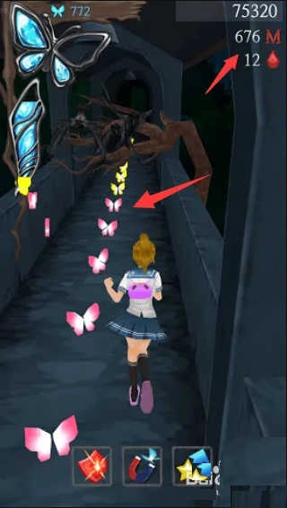 蝴蝶并非装饰,而是游走于长廊缝隙间的稀有灵体。高速奔跑时留意墙角微光、天花板裂隙或镜面倒影,及时滑动捕捉。收集越多,结算评分越高,金币奖励越丰厚。