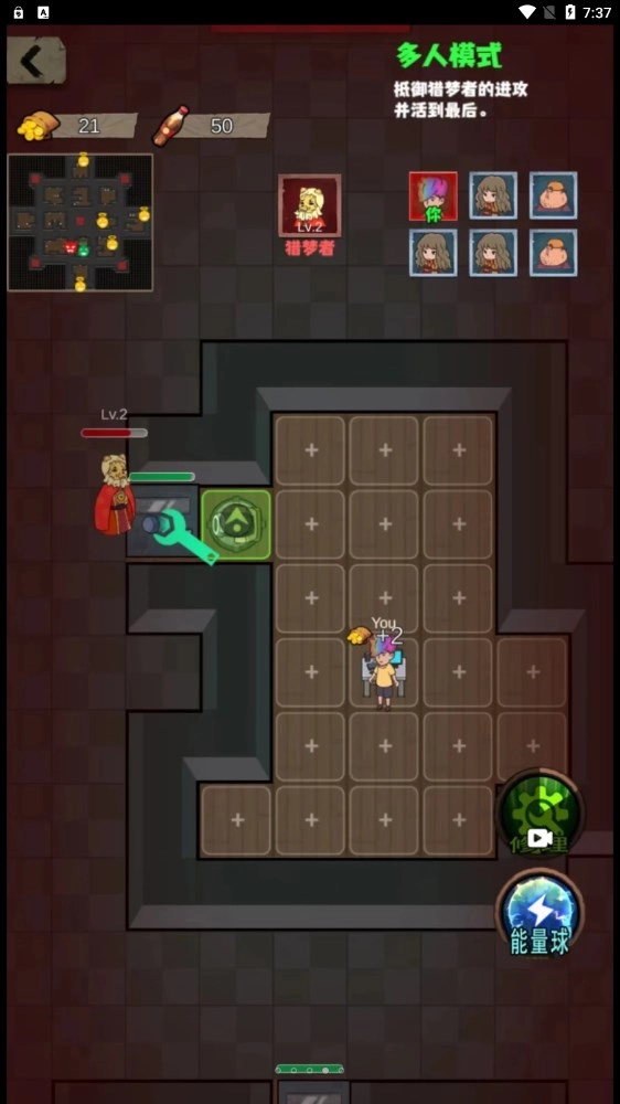 4、玩家既能操控人类角色,在电脑桌前搭建炮台,抵御入侵的猛鬼猎梦者。