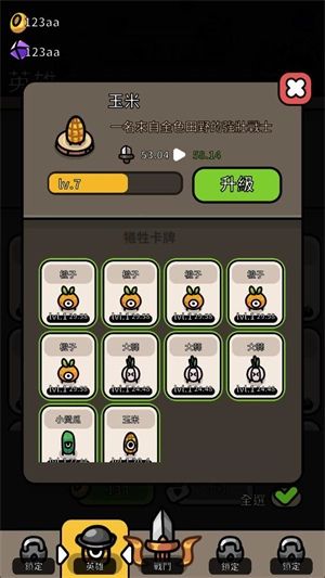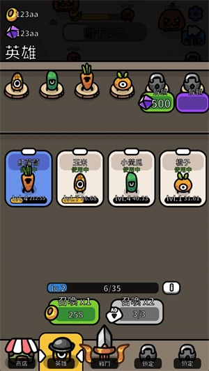 点击下方的英雄按钮能够召唤出各种各样的水果,召唤完成后,你既可以选择让它们上阵战斗,也可以用它们来强化其他水果。