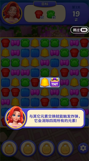 5当五个同色系的小物件以直角排列时,就能生成一枚特殊道具;只要让它和旁边的物件互换位置,这枚道具就会立刻启动,瞬间清除其周围所有的同类物件。