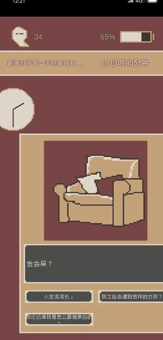 这是一款颇具趣味的分手模拟游戏,玩家能在此真切体验刚分手男性的24小时。对这个男人而言,这24小时充满煎熬,他得借助各类事务来转移注意力。游戏设有两个结局:成功撑过24小时与失败。判定条件是丧值不可为0,一旦丧值归零,他就会拨打前女友电话,游戏随之失败。而玩家做出的每个选择,都会导致丧值产生不同程度的变化。