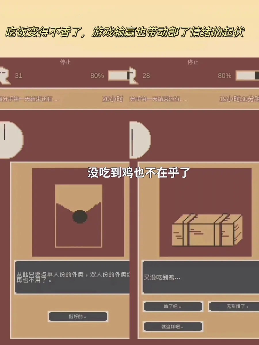 1、一种结局是玩家顺利协助主角度过了分手后的24小时,主角的丧值未变为负数,也没有联系前女友,游戏成功通关。