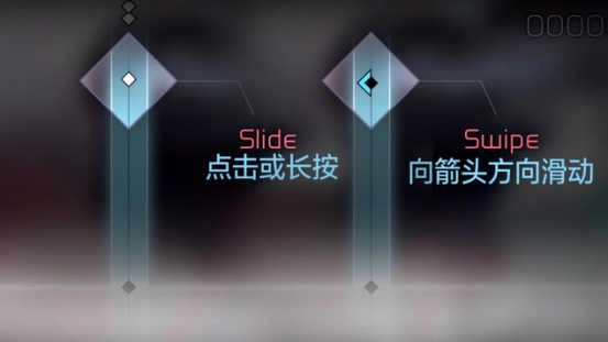 ④长条菱形音符上会带有白色横条,玩家需要在按住该音符的同时,朝着白条指示的方向滑动,并且滑动过程中要注意契合节奏,不然很容易在中途出现Miss情况。