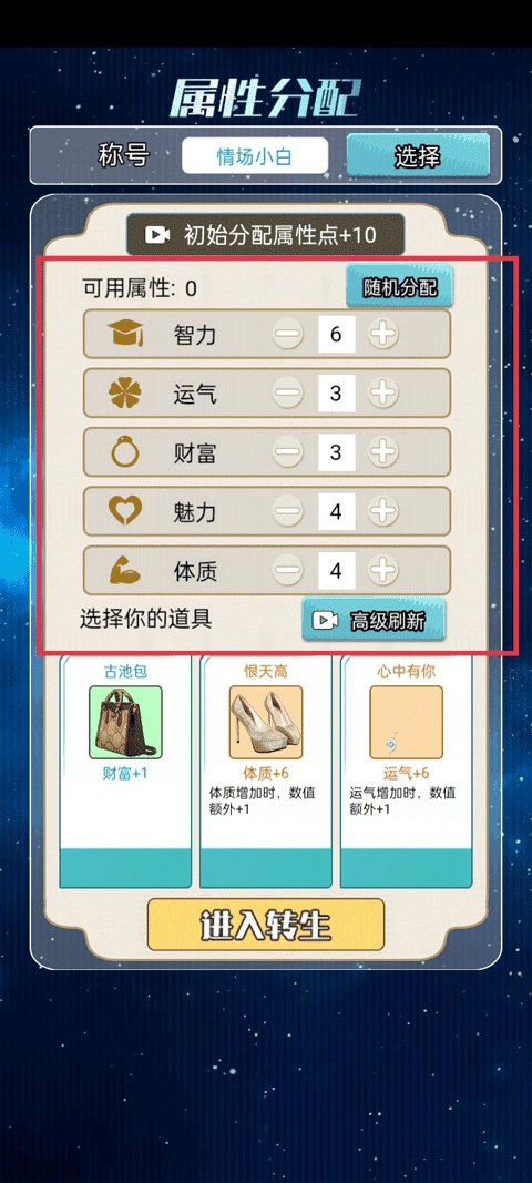 3、属性分配初始有10个点,可根据自身需求添加到智力、运气、财富等属性上,之后选择加持道具即可进入转生环节。