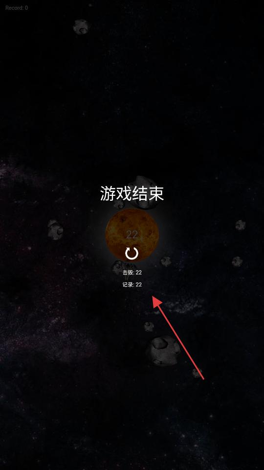 3、战斗结束后,会呈现游戏结束界面,在此界面可查看击毁数、记录等数据。若打算重新开始游戏,点击界面上相应的重新开始按钮,即可再次进入太空战斗流程。