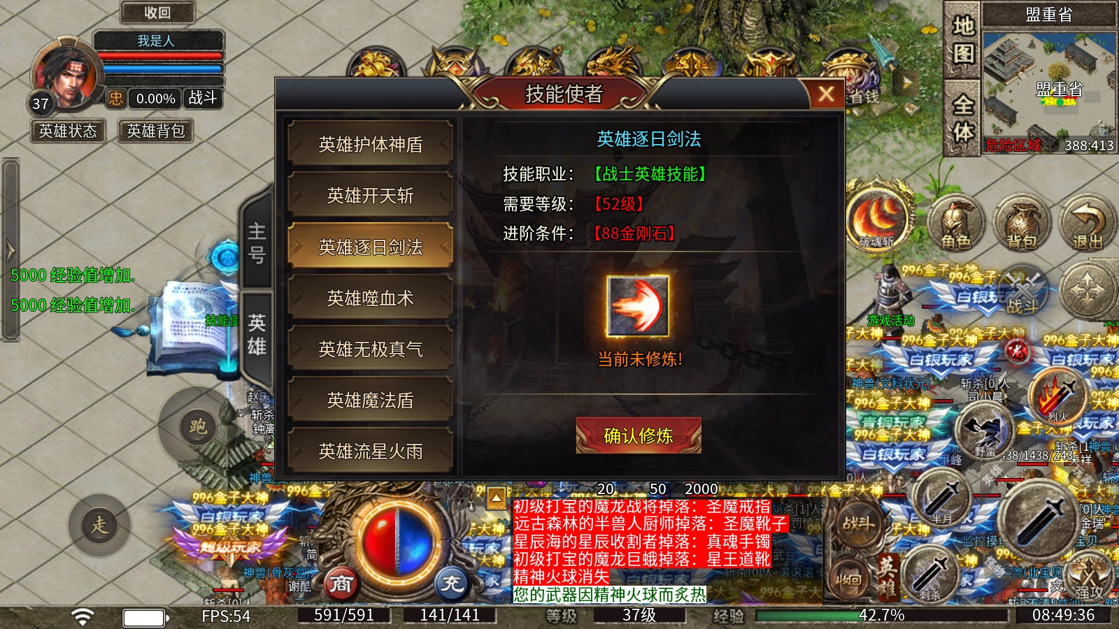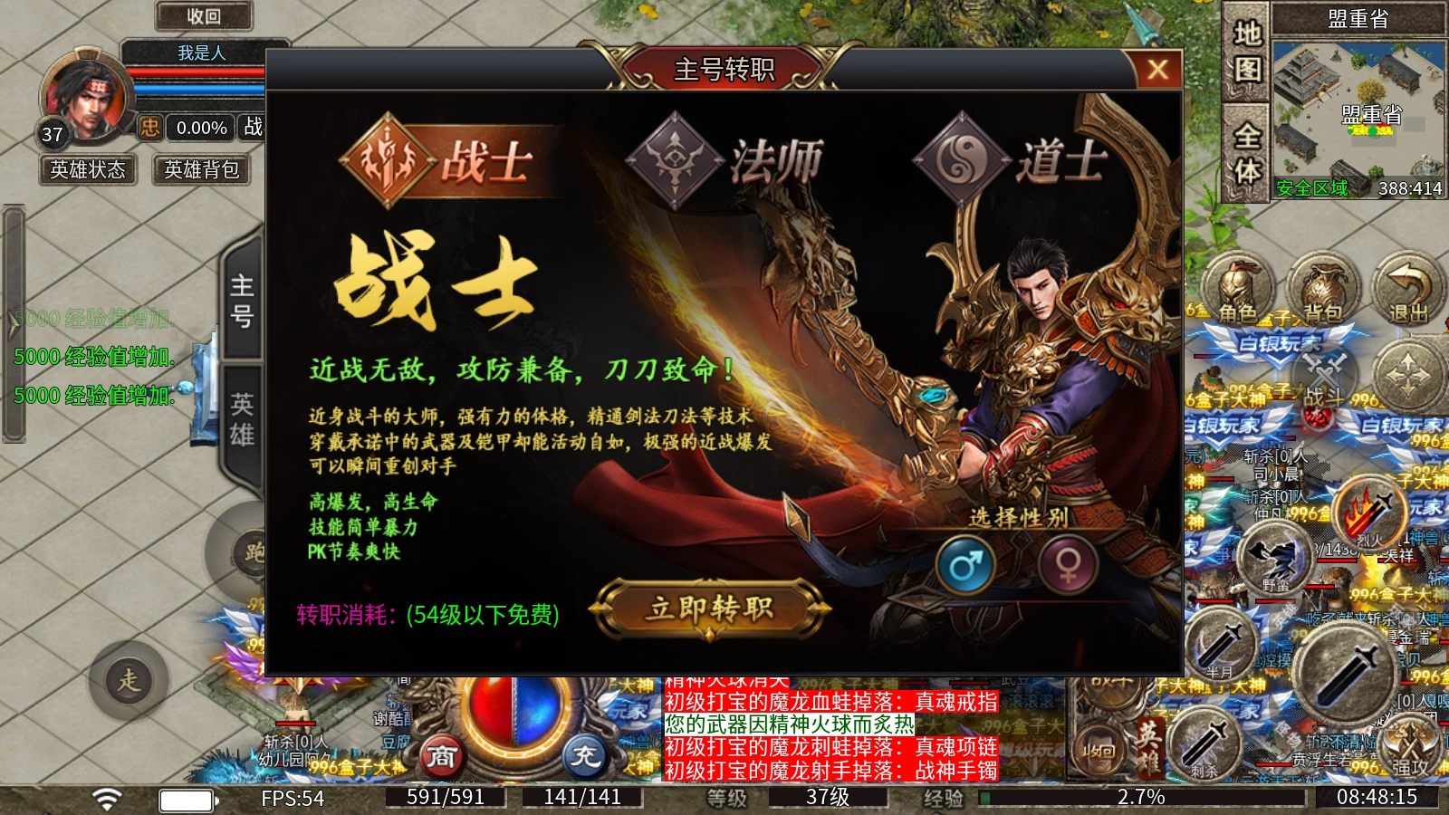 主号转职规则:等级低于54级时,可在盟重省的NPC处免费完成转职操作,职业与性别均可更改。此外,主号和英雄均支持转职功能。