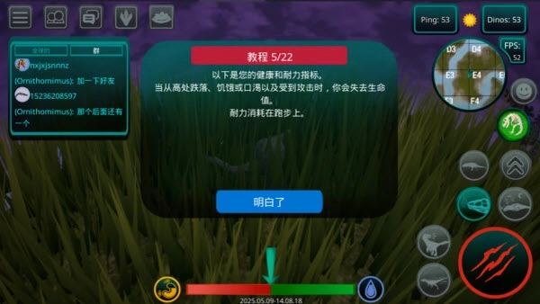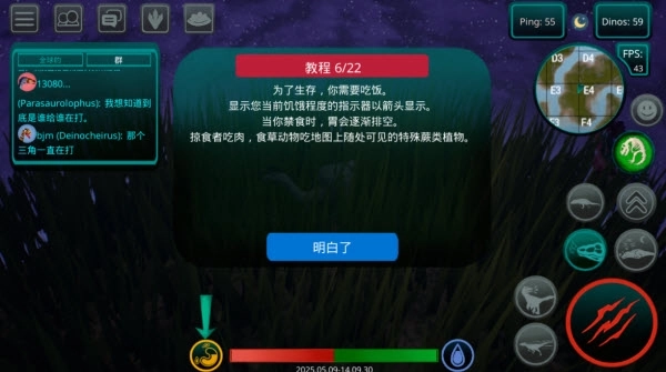 6、生存离不开进食,左下角的饥饿指示器会显示当前的饱腹程度。肉食恐龙要通过捕猎其他生物获取食物,植食恐龙则能啃食地图里生长的蕨类植物来果腹。