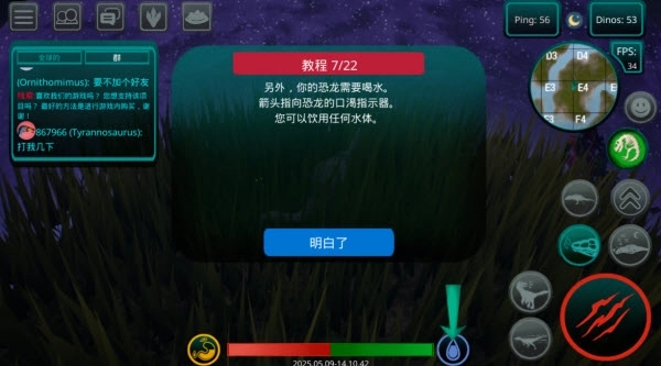 7、口渴同样会对生存构成威胁,恐龙需要定期饮水。口渴指示器用箭头来标识,所有的河流、湖泊都能当作水源来补充水分。
