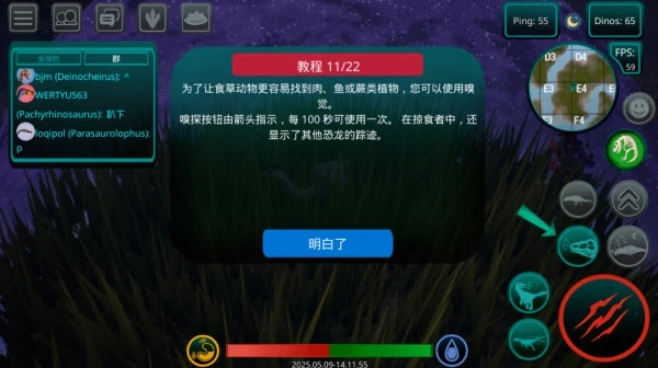 9、嗅觉系统可帮助你快速定位资源。食草恐龙能借助它寻找植物,掠食者则可以通过它追踪其他恐龙的踪迹。这个功能每100秒能够使用一次,箭头指向的就是嗅探按钮。