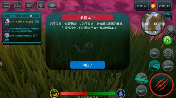 2、屏幕左侧配备虚拟摇杆,可用来操控恐龙的移动方向,操作既流畅又直观,能让你轻松驾驭这只史前巨兽。