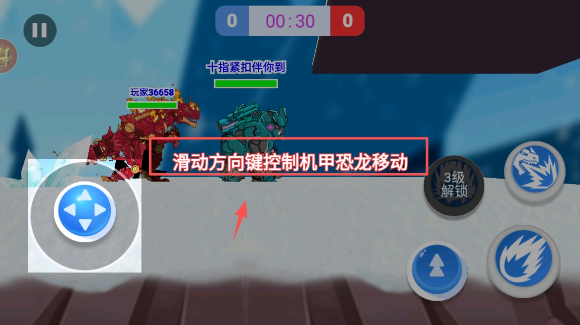 2、接着,通过滑动方向键操控机甲恐龙移动,避开障碍物,搜寻敌人并展开战斗。
