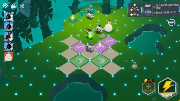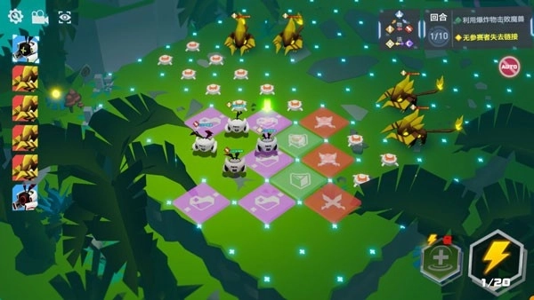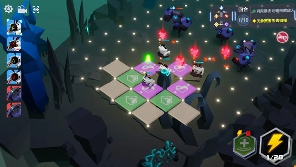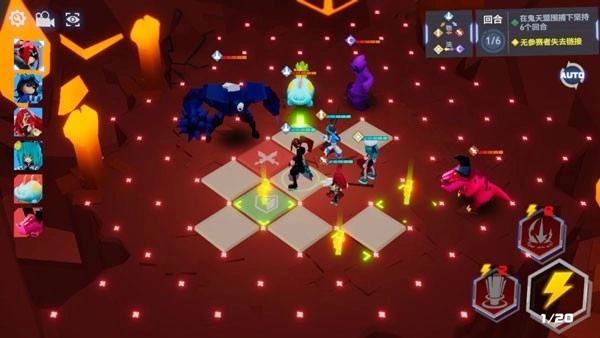 进入战斗模式后,左上角会显示参赛者和敌人的行动顺序,右下角是元力值和技能,右上角是关卡目标和剩余的战斗回合数。而整个战场会被分成若干个小地格,天使们需要指挥参赛者在这些地格间移动,排兵布阵,并在限定的回合内击败所有的敌人。