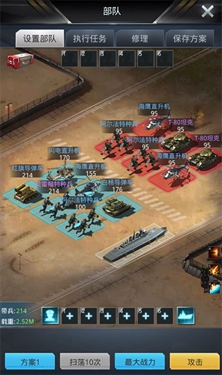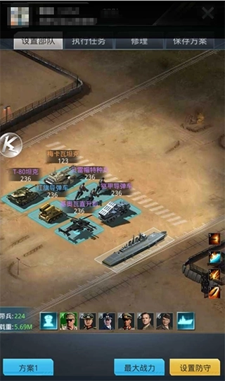 布阵的时候,如果确定敌方阵容,那么原则上来说,第一排不放置被敌方克制阵容,然后放置克制敌方部队的兵种,没有克制则坦克和特种兵优先。第二排原则上也是放置克制敌方部队的兵种,不然就多放置导弹车和飞机,能大大补足输出。