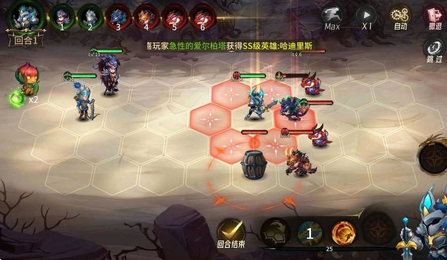 3、在六边形网格战场上灵活调整英雄站位,借助火药桶等场景机关扭转战局走向,达成以智取胜的战术目标。