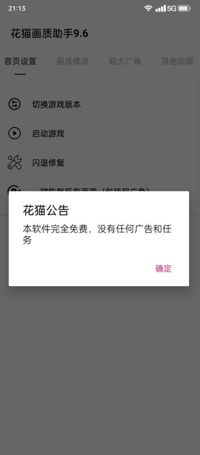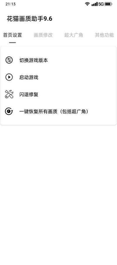 1、软件首页为玩家提供了切换游戏版本、启动游戏、闪退修复、一键恢复所有画质等功能选项。
