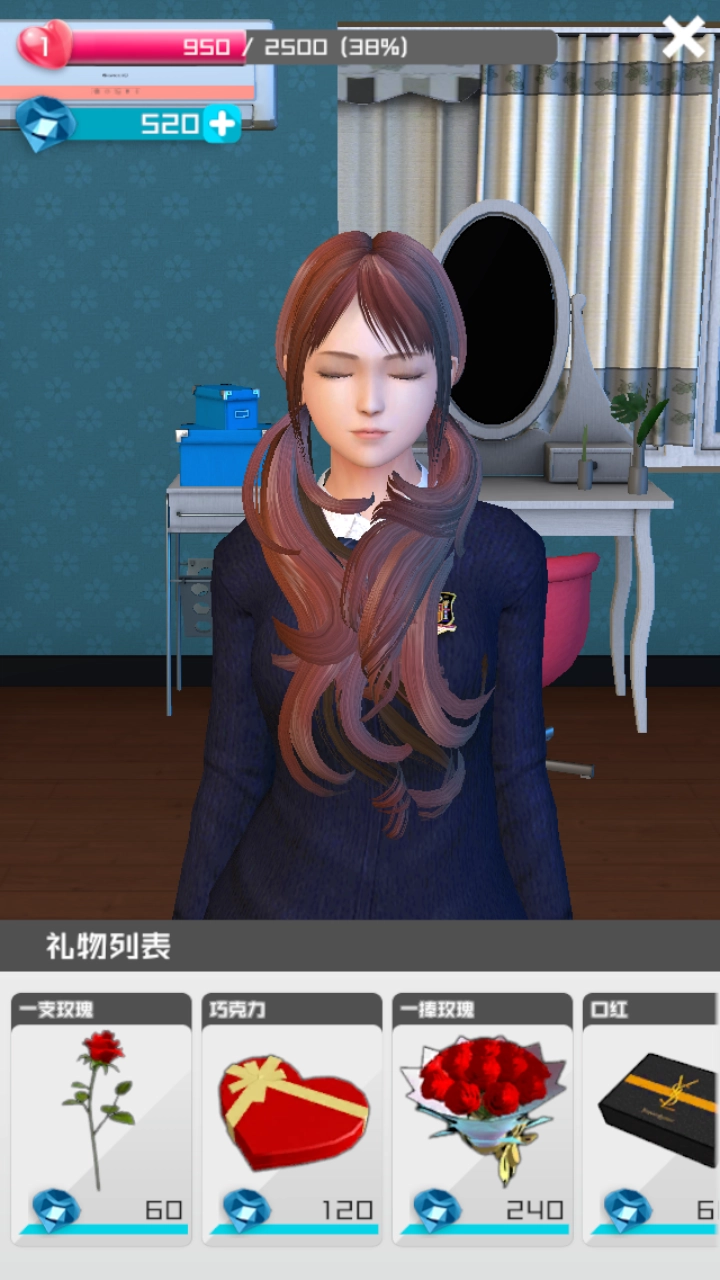 赠送礼物要选对时机。当Luna在洗漱、运动、吃饭的时候,是不能给她送礼的,得等她闲下来才行。送礼物能让她的好感度涨得很快,可选的礼物有玫瑰、巧克力、口红、香水、钻戒这些。送成功之后,会弹出一个15秒的“好感争夺”小游戏,只要快速点屏幕上出现的爱心,就能一直拿额外的好感值。