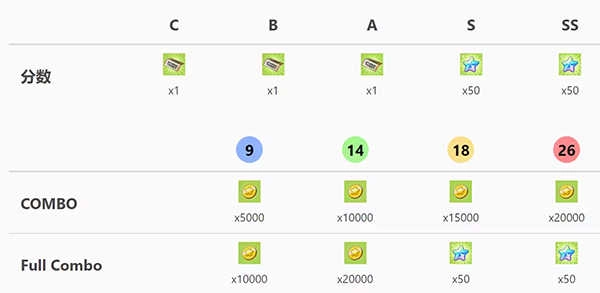 打歌奖励规则如下:分数达到SS评级可获得100星石;另外,若能在Hard难度、EX难度(包含Special难度)中达成全连,每个难度的全连都会给予50星石。