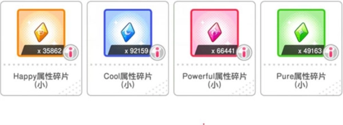 上图里的分别是橙色、蓝色、红色、绿色的小属性碎片。与之对应的是,成员也被划分成Hy、Cool、Powerful和Pure这四个属性类别。接下来展示的是四个属性的卡牌示例。