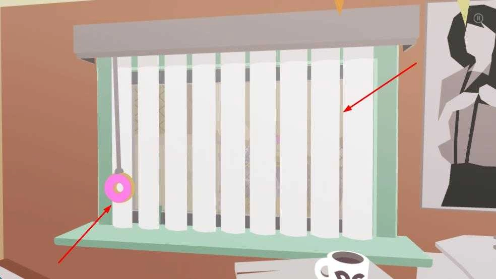 在室内场景中,找到粉色甜甜圈这一互动元素,通过操作它来触发与百叶窗等场景的互动,从而解锁新的内容。