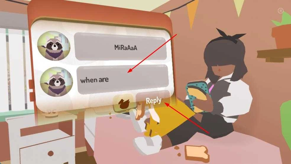 进入对话场景后,留意MiRaAaA发送的when are消息,点击Reply按钮进行回复,以此推动剧情交流的进展。