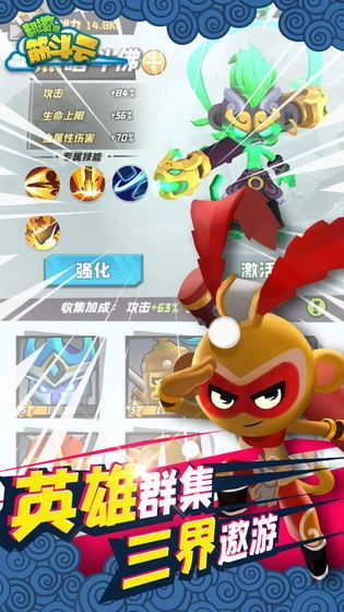 翻滚吧筋斗云的菜单设定,采用了广为人知的西游故事作为人物背景,并且融入了当下十分火爆的roguelike闯关玩法。玩家在每次挑战关卡的过程中,都会随机解锁各式各样的能力,合理搭配这些技能,能让你更顺利地完成闯关!