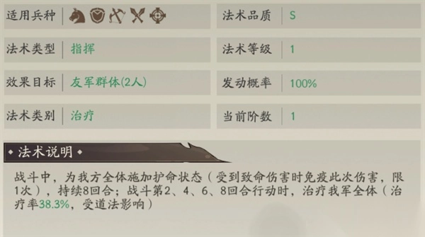 固有法术“风雨莫测”会稳定触发效果:为全队施加持续8回合的护命状态(受到致命伤害时免疫1次),且在这8回合内的偶数回合为全队进行治疗。该法术对长线战斗阵容的收益十分显著,护命状态在应对高爆发阵容时也能发挥出色效果。法术“以屈求伸”可降低友军受到的伤害。上述两个法术均在战斗准备阶段释放,因此不会受到孔宣固有法术的影响。“乌云压顶”能够解除友军的负面状态并进行治疗。这套法术组合整体以恢复与保护为主,可有效保障主将的输出能力。