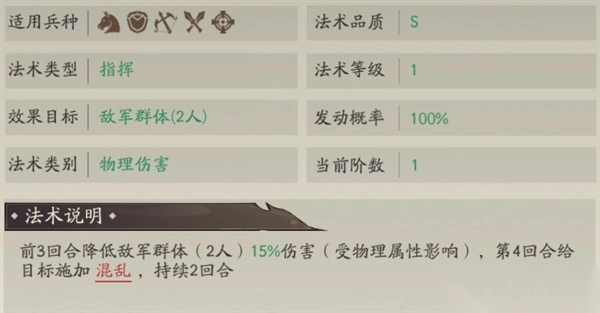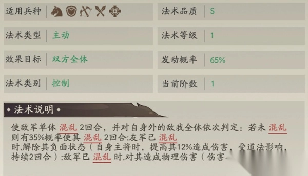 固有法术“神石横飞”能在前三回合降低敌人伤害,到第四回合则施加群体混乱效果,作为开局必触发的强力法术,它可为孔宣创造输出空间,而第四回合稳定触发的群体混乱还能增强阵容的出伤能力。法术“岿然不动”是辅助神将常用的强力法术,兼具控制与治疗功能。法术“方略无双”能在攻击后触发友军补伤,以此强化主将的输出。值得注意的是,这两个主要增益法术都会在战斗准备回合释放,从而避开了孔宣固有法术的影响。