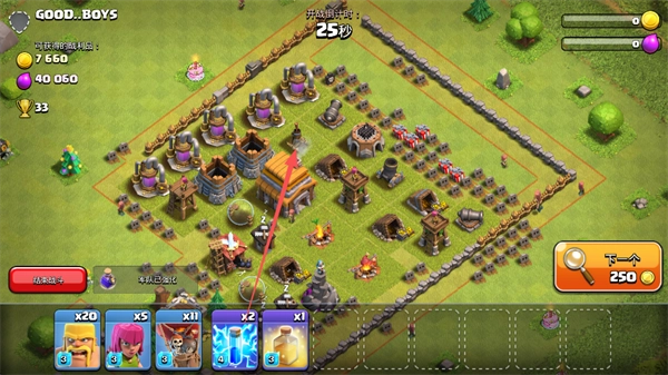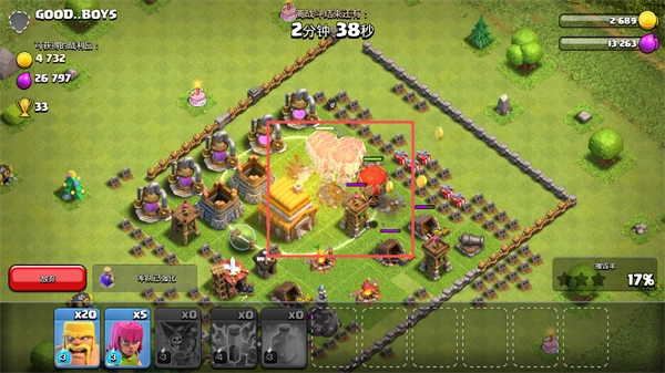 画面右侧被红色标记的区域内有两名女武神角色,她们会主动破坏墙体,墙体被破坏后会移动去攻击圣水储存容器。