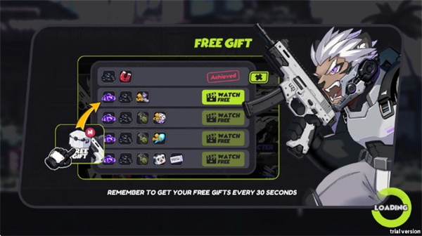 1、进入游戏后,点击屏幕上显示的“TOUCHSCREEN TO PLAY!”提示就能开始游戏;加载期间玩家可以领取免费礼物,这些礼物会每隔一段时间刷新,能获取到一些基础资源和道具。