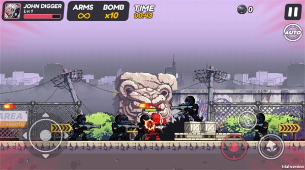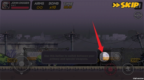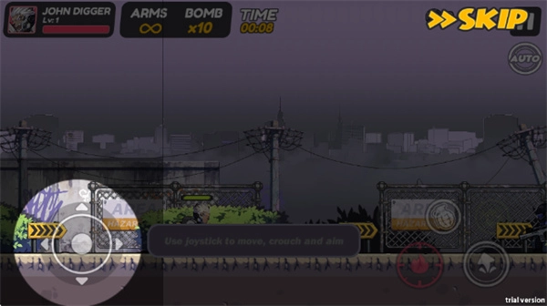 6、关卡开始时会播放一段剧情动画可以等待结束也能直接跳过,进入战斗后左侧摇杆负责移动、下蹲和瞄准而右侧按钮用于射击等操作。