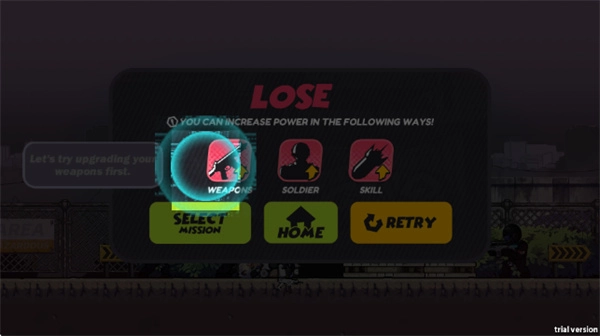 10、如果复活失败或依旧无法通关可以返回主界面,先强化武器、士兵或技能再重新挑战关卡会明显轻松不少。