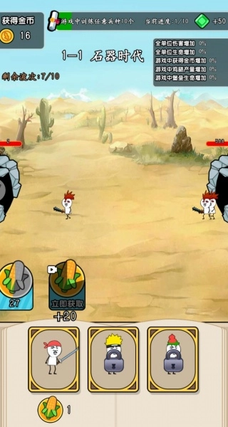 1、进入对应时代的关卡后,先查看剩余波次和战场状况,依据敌方的攻势来挑选训练合适的兵种,搭建起基础的作战队伍。