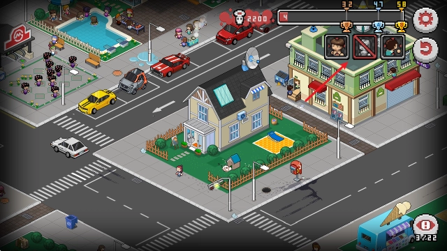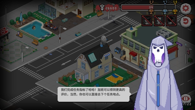 死神来了是一款像素风格策略解谜游戏,玩家扮演“代理死神”,通过操控环境物品制造意外事件,收割城市中人类的灵魂。游戏以非线性解谜为核心,强调蝴蝶效应与策略布局,玩家需利用场景中的危险物品(如广告牌、电路、高空坠物等)触发连锁反应,完成灵魂收割任务,玩家可自由探索场景,无需遵循固定流程,通过观察NPC行为规律与环境逻辑,在合适时机触发机关,不同区域呈现昼夜交替效果,天气变化影响事件触发,游戏采用45度斜角视角,人物为Q版二头身造型,动态天气系统增强沉浸感,每关包含三个阶段,后期解锁“死神之眼”技能,可预判人类移动轨迹,玩家需结合NPC行为规律与环境物理逻辑,在天使监视限制下完成灵魂收割指标,体验“触发者”与“危险放大者”的双重角色。