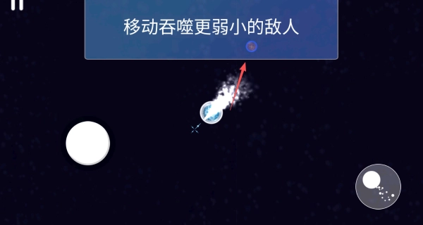 游戏开始时,先把注意力放在熟悉移动和吞噬的操作上,在初始的星域里吞噬3个小型天体,同时掌握好摇杆和喷气按钮的配合技巧,以此来积累初始的质量。