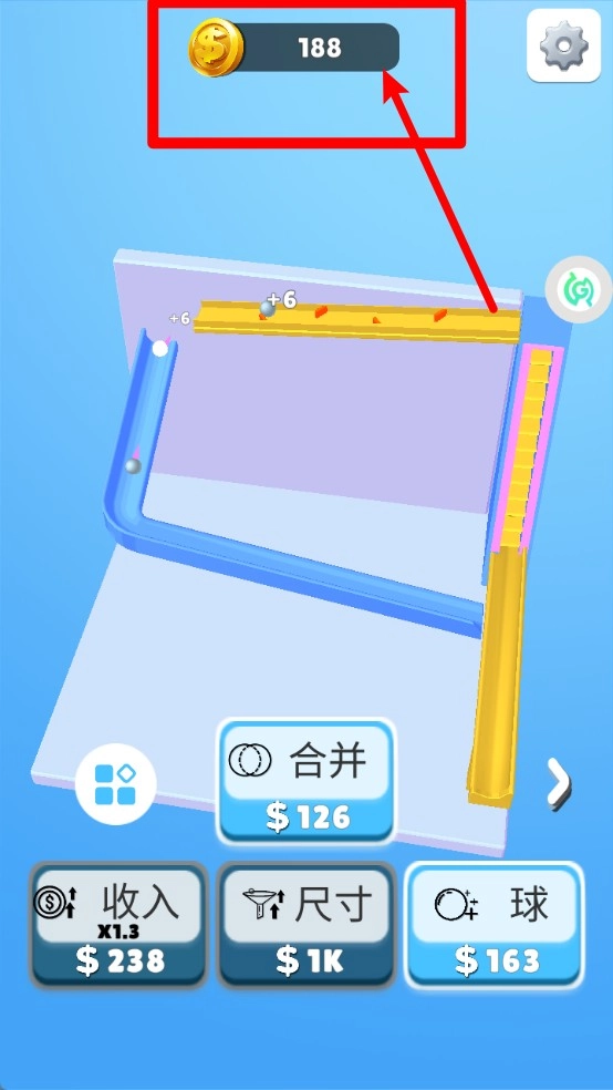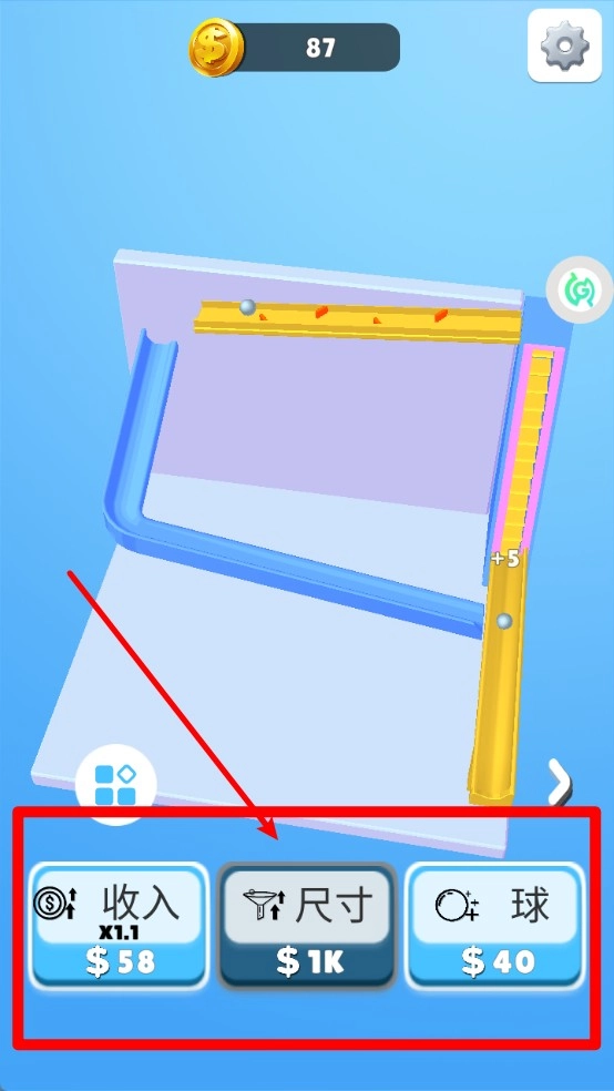 3.底部的功能选项有收入、尺寸和球这几项,玩家能够花费金币对这些属性进行升级,以此提升游戏效率与通关速度。